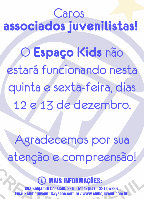 Aviso: Espaço Kids – 12 e 13/12